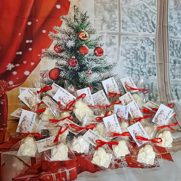 Każde mydełko pakowane jest estetycznie – w przezroczystą folię z ozdobną wstążką i bilecikiem “Wesołych Świąt”.