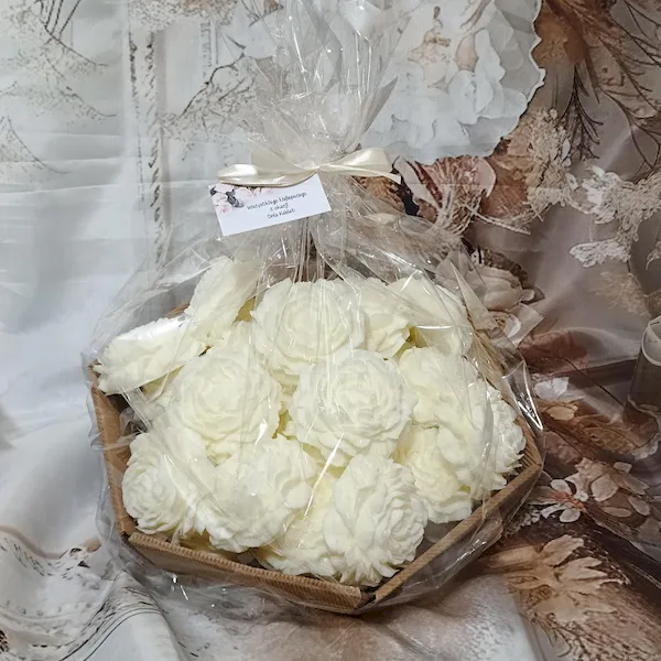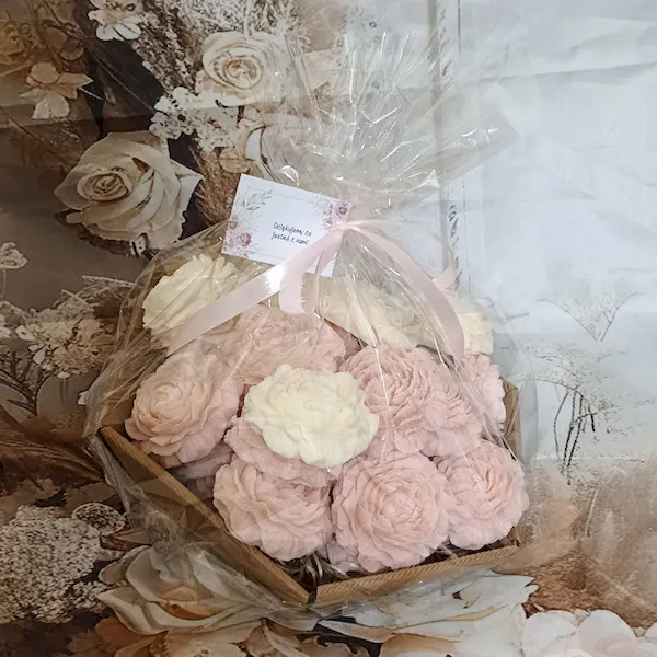 Poznaj nasz elegancki kosz upominkowy wypełniony po brzegi 30 dużymi, ręcznie robionymi mydełkami glicerynowymi w kształcie piwonii – symbolem miłości, wdzięku i dobrobytu.