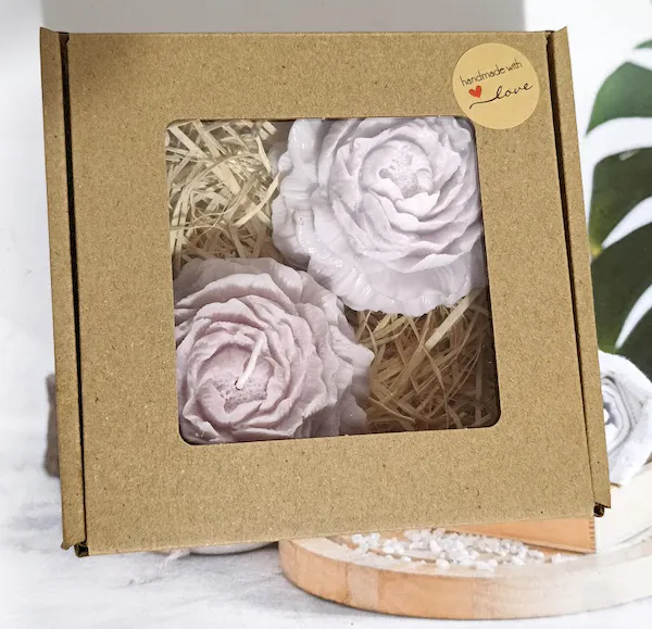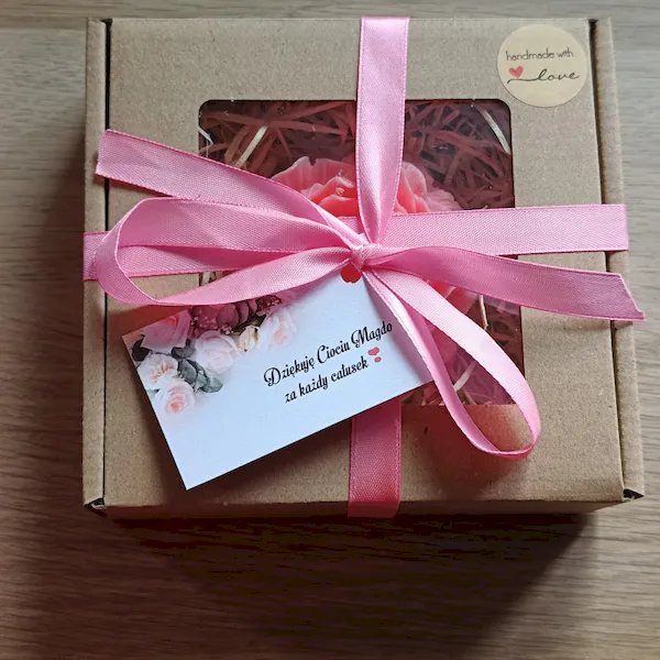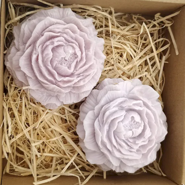 Mydło glicerynowe duży kwiat piwonii + świeca woskowa sojowa w pudełku elegancki prezent na Dzień Babci Dzień Kobiet z dedykacją