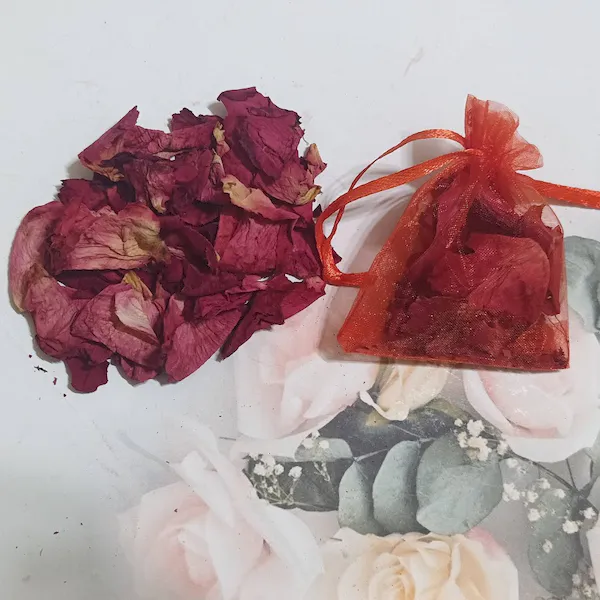 Naturalne suszone płatki róż w małym woreczku z organzy – aromatyczna dekoracja i prezent na podziękowania
