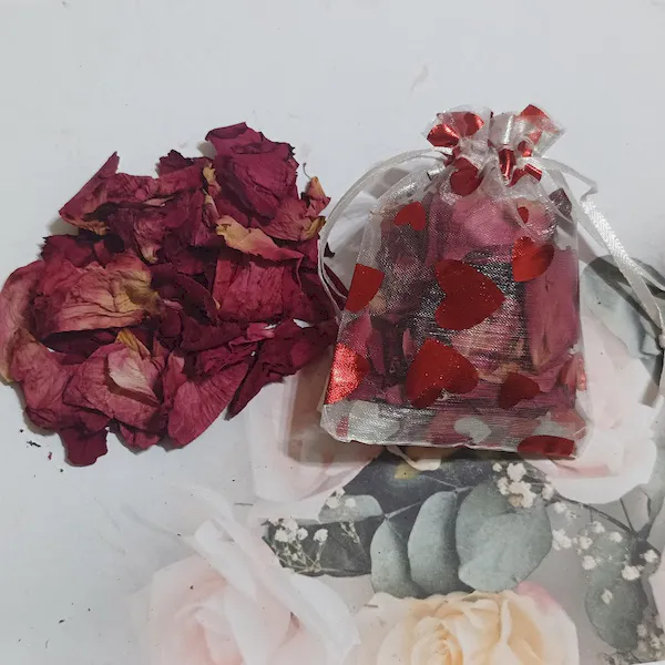 Naturalne suszone płatki róż w eleganckim woreczku z organzy to wyjątkowy dodatek do domowego SPA, dekoracji i aromaterapii. Suszone płatki róż idealne do kąpieli relaksacyjnych, jako pachnąca saszetka do szafy lub romantyczny akcent w wystroju wnętrz. Woreczek zdobiony czerwonymi sercami dodaje uroku i sprawia, że to świetny pomysł na prezent.