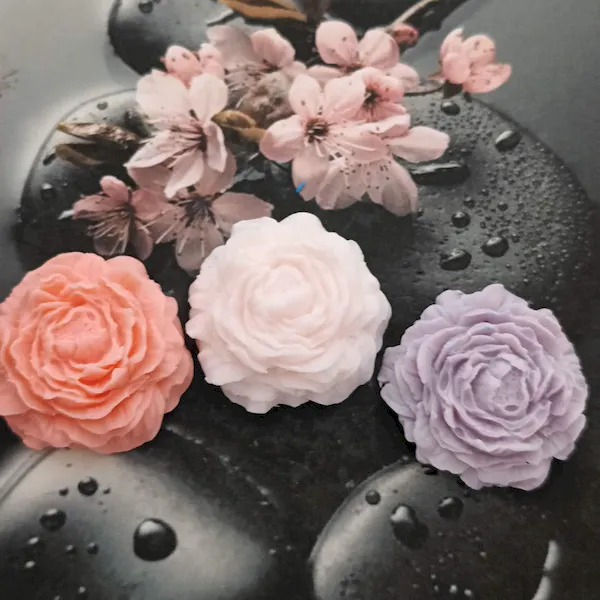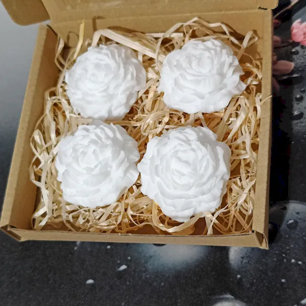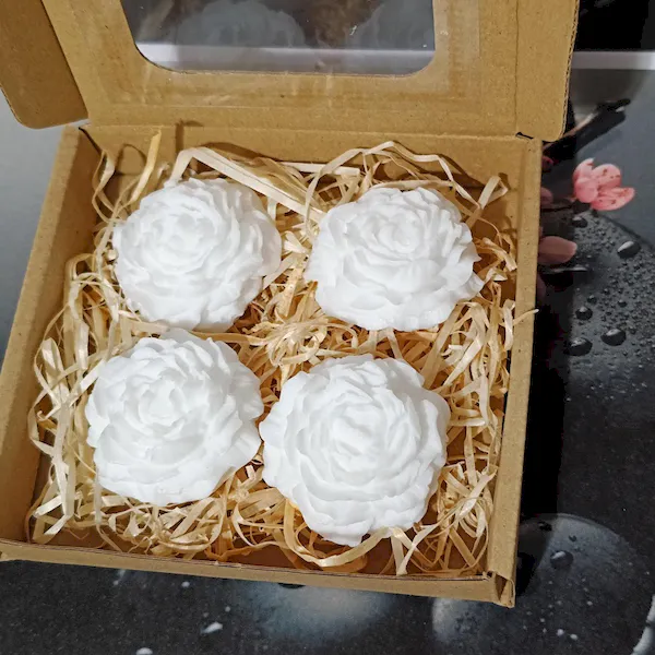 Zestaw 4 mini mydełek glicerynowych w kształcie piwonii w pudełku Dzień Babci Dzień Kobiet Komunia Ślub Chrzciny